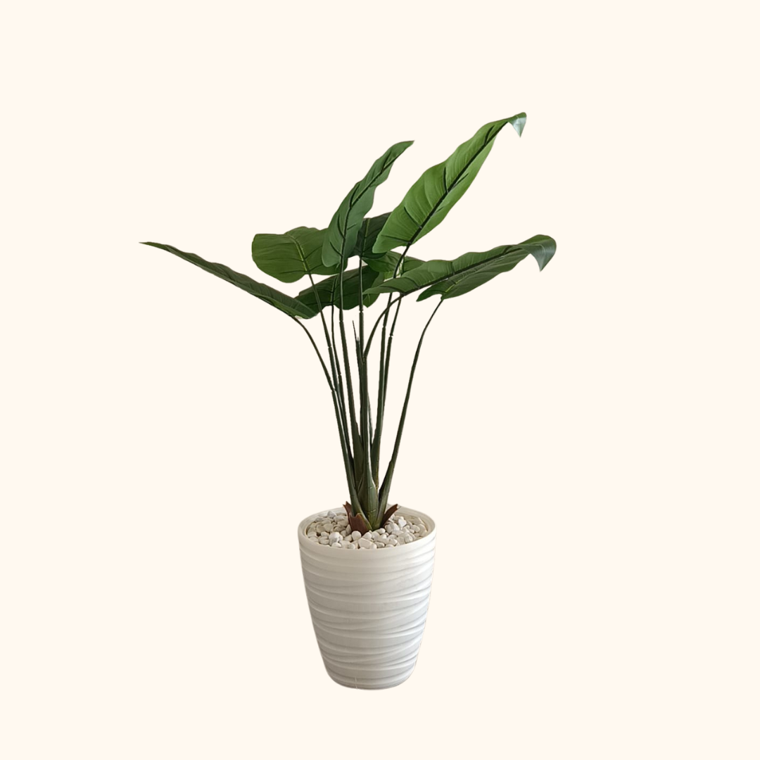 2 Plantes artificielles Alocasia Cucullata et bananier. Des feuillages denses, un rendu bluffant, pour un intérieur toujours élégant.