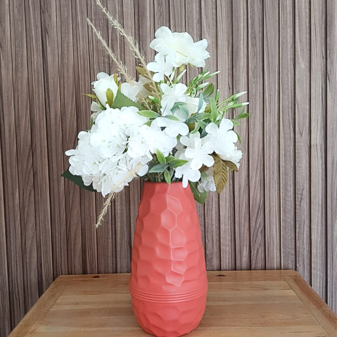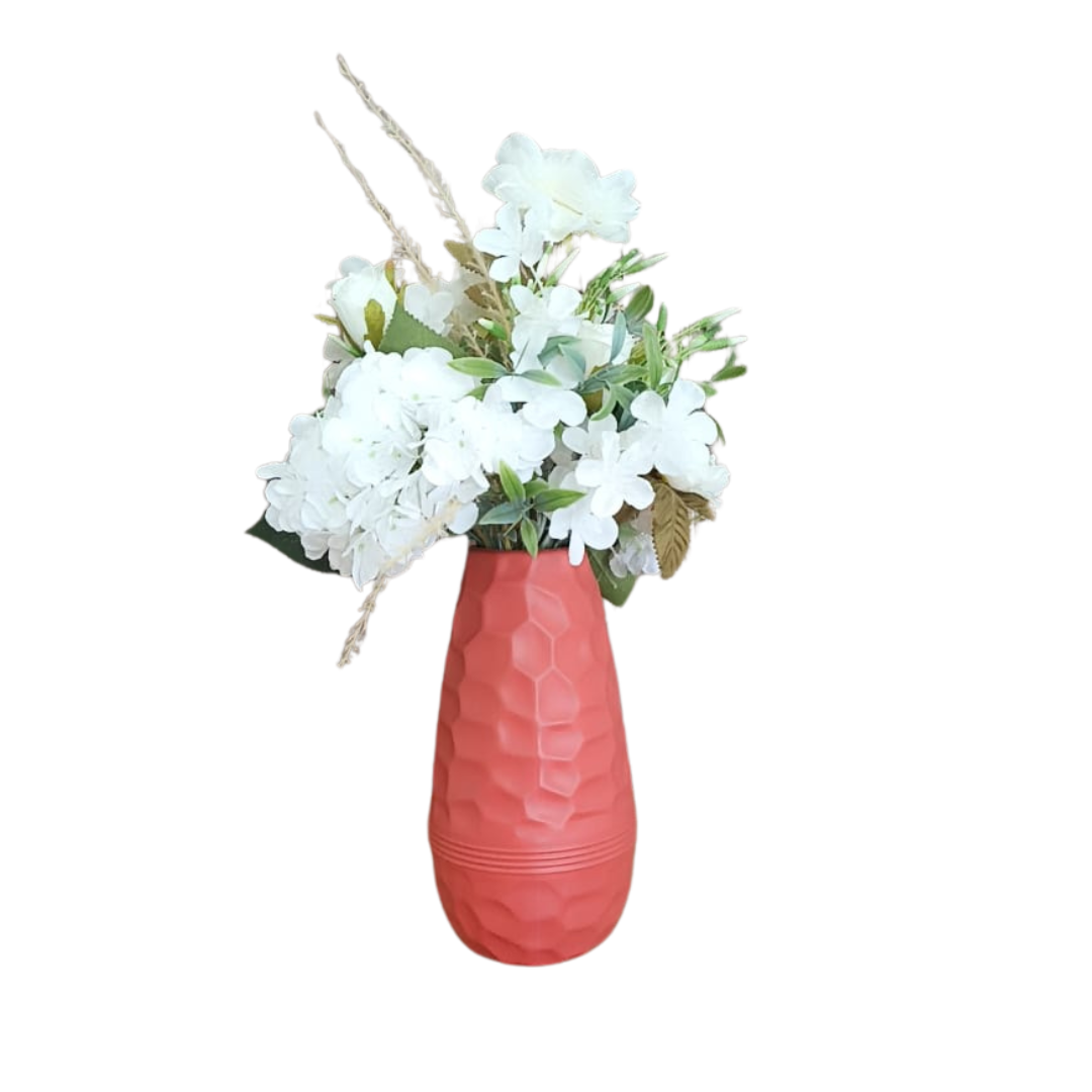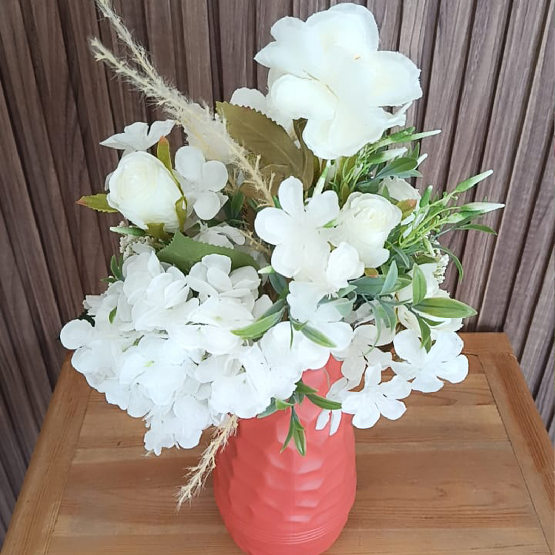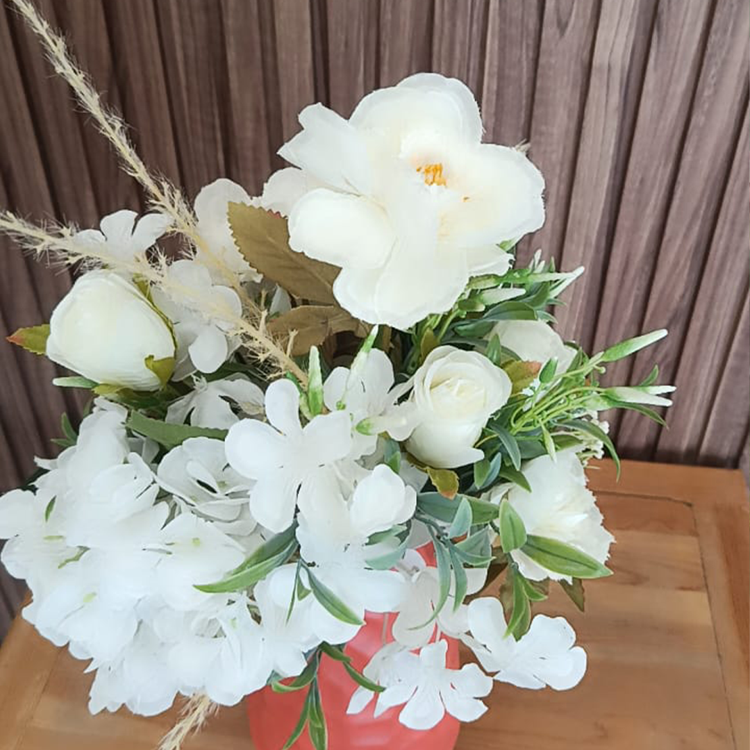 Ce bouquet d’exception associe la pureté des fleurs artificielles blanches à la puissance visuelle d’un vase orange au design texturé. Les fleurs, aux formes délicates et élégantes (roses, pivoines ou lys selon la variante), évoquent la fraîcheur et la sérénité, tandis que le rouge profond du vase apporte une touche de passion, d’énergie et de raffinement. Ce contraste saisissant crée une harmonie parfaite entre douceur et intensité.