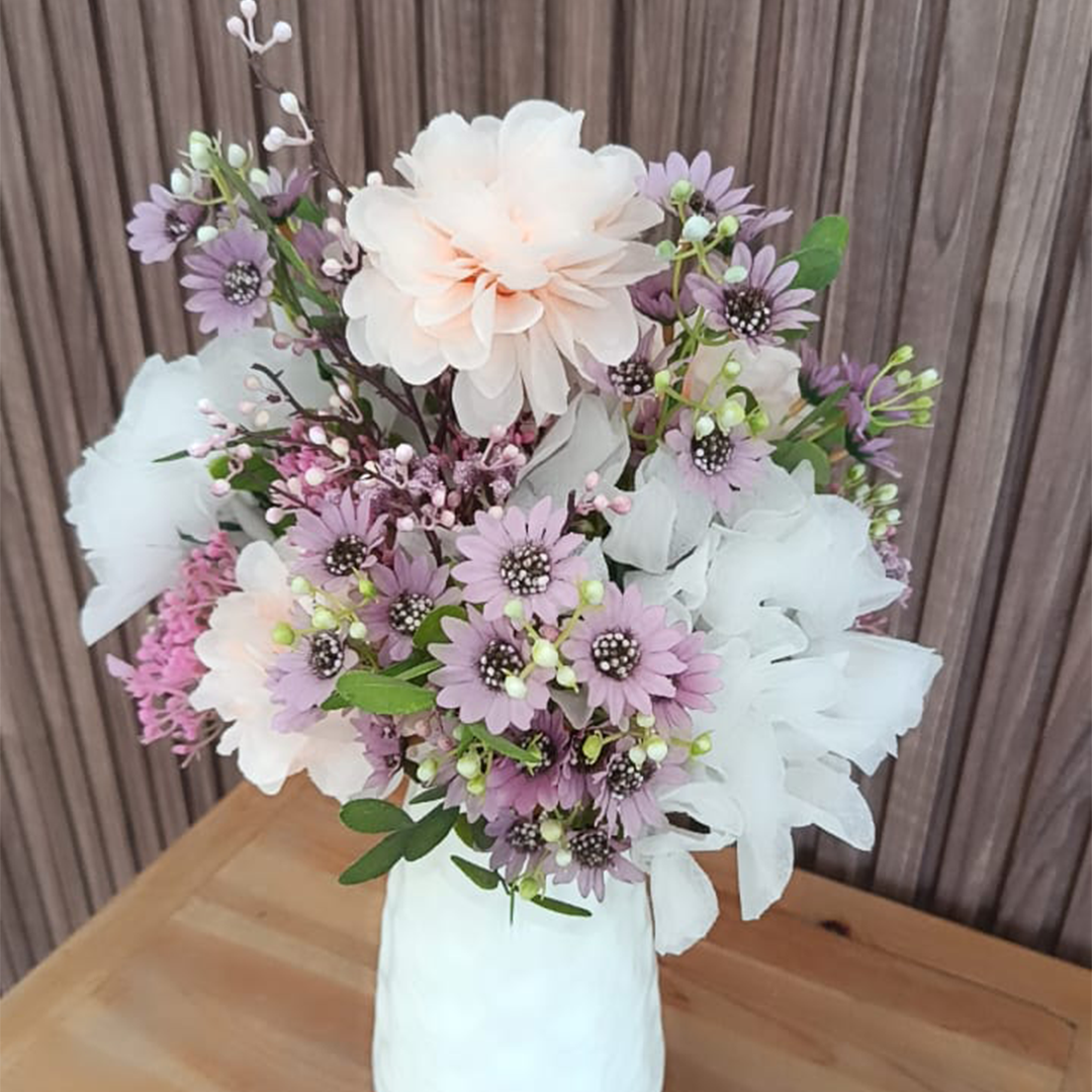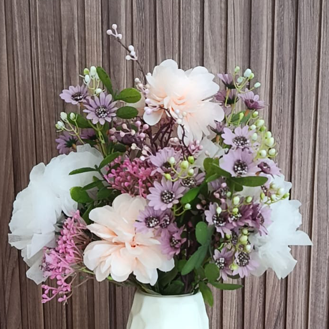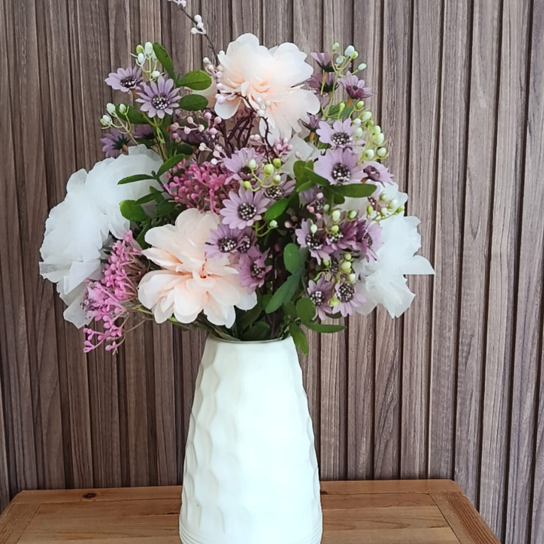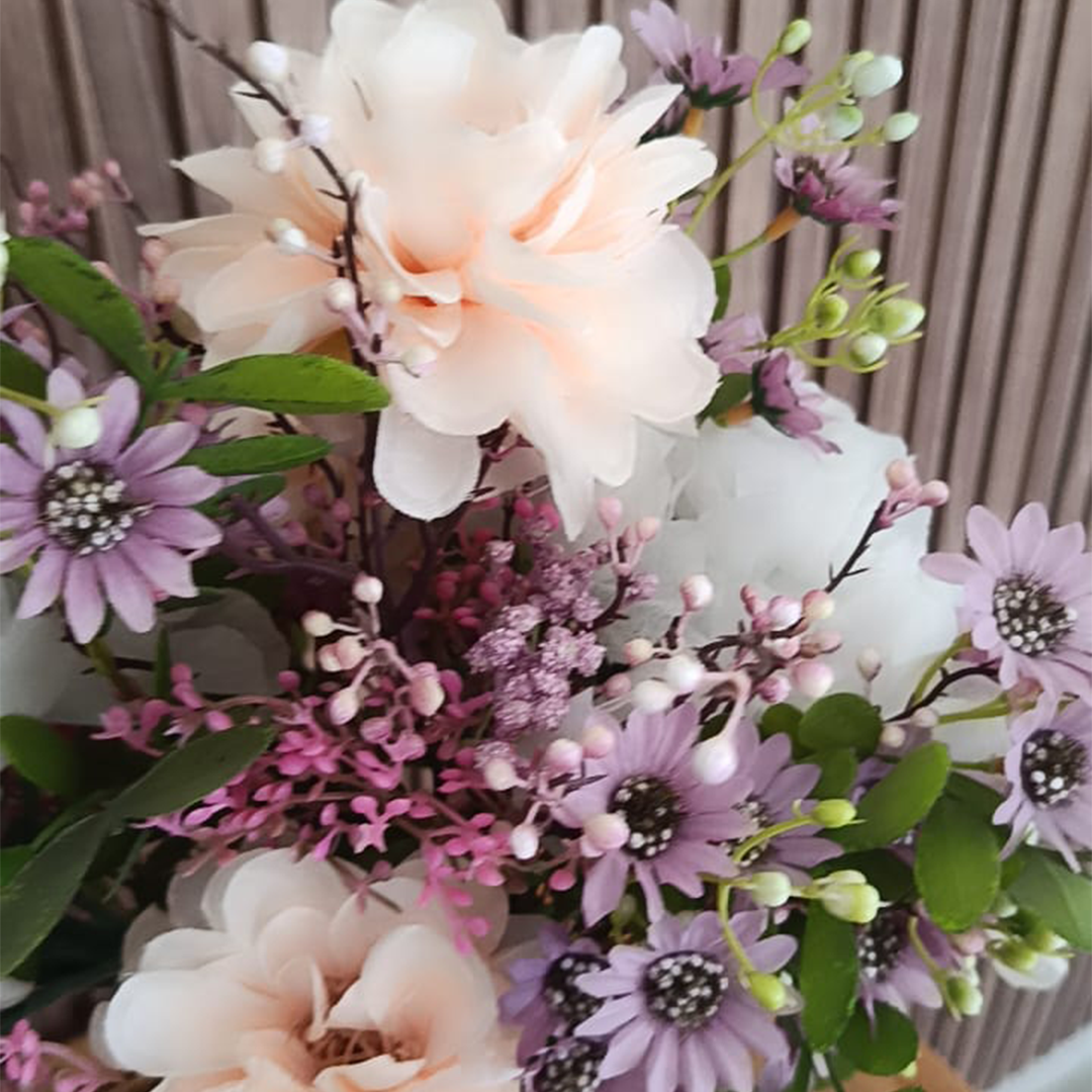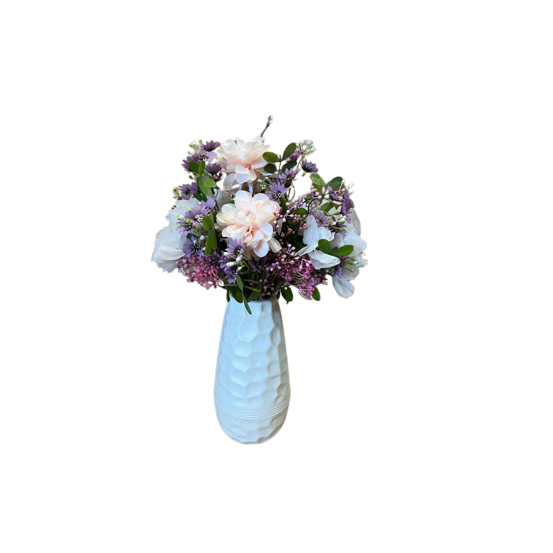 Ce bouquet raffiné est composé de fleurs artificielles aux tons doux et pastel. On y retrouve des pivoines rose pâle, des petites fleurs mauves, et un feuillage délicat qui apportent une touche de fraîcheur et de poésie. Le tout est magnifiquement disposé dans un vase blanc plastique au motif alvéolé, ajoutant une touche moderne et élégante à n’importe quel intérieur.